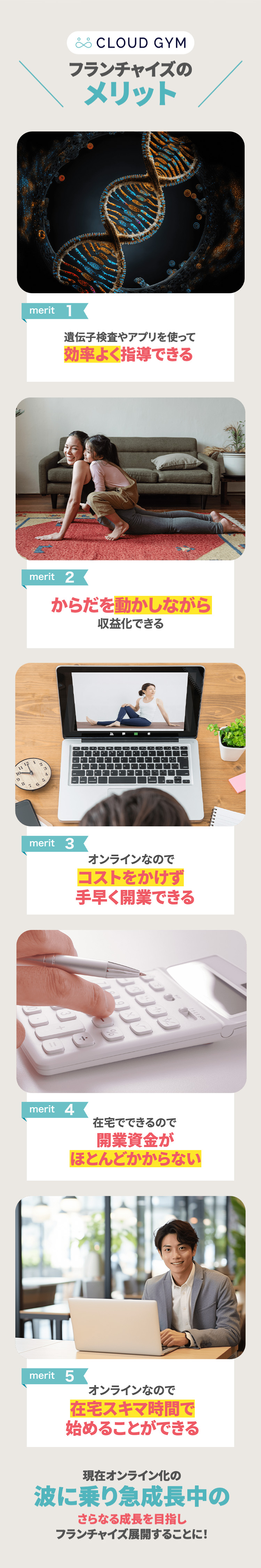 一般的にジムを開業するには、初期投資で1000万円ほどかかります。しかし、CLOUD GYMなら初期費用がほとんどかからず、自宅で取り組めるため固定費もかかりません。このためリスクがほぼゼロで始められるビジネスモデルとして注目されています!